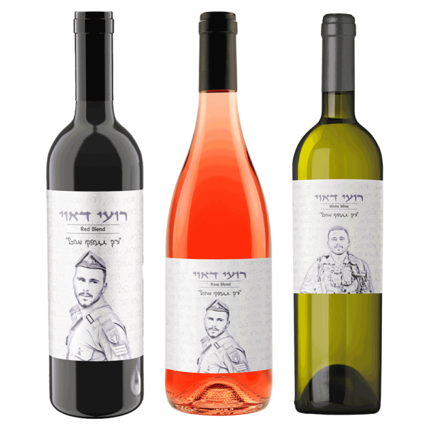 שלושה בקבוקי יין לזכר רועי דאוי. יין אדום, לבן ורוזה.