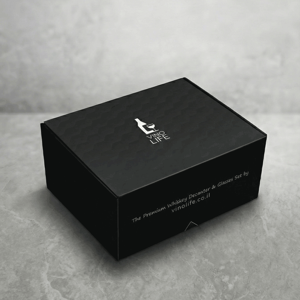 אריזה שמשדרת יוקרה הסט נח בתוך קופסת אספנים שחורה וקשיחה, עם לוגו כסוף עדין. האריזה כוללת תבנית ספוג פנימית שנועדה להגן על הזכוכית מפני זעזועים ושריטות, ומאפשרת אחסון בטוח בארון או הצגה מרשימה כשהיא פתוחה.