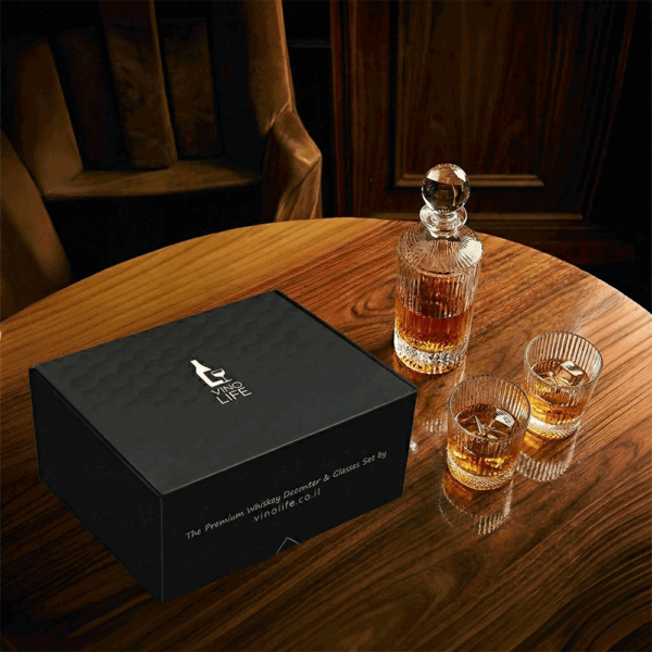 אריזה שמשדרת יוקרה הסט נח בתוך קופסת אספנים שחורה וקשיחה, עם לוגו כסוף עדין. האריזה כוללת תבנית ספוג פנימית שנועדה להגן על הזכוכית מפני זעזועים ושריטות, ומאפשרת אחסון בטוח בארון או הצגה מרשימה כשהיא פתוחה.