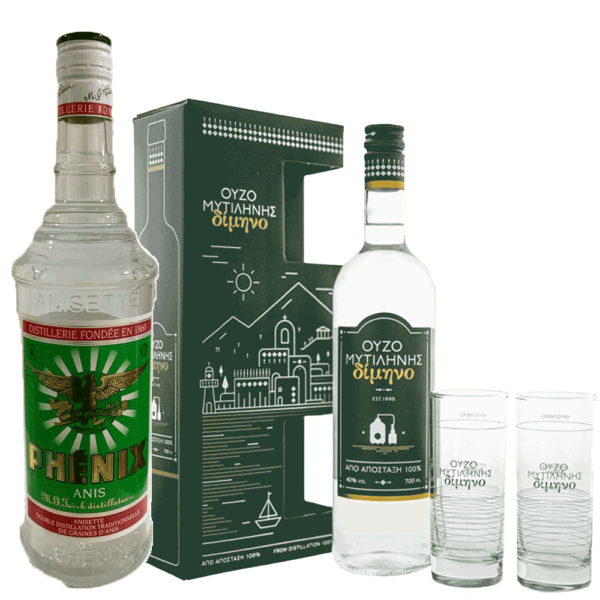 מארז הכולל בקבוק אחד של ערק ושני בקבוקי אוזו | מגיע עם שתי כוסות |